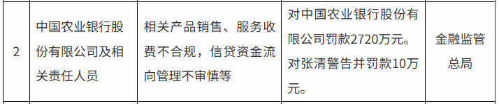 【大河财立方消息】10月31日,国家金融监管总局披露的行政处罚信息显示,中国农业银行股份有限公司因相关产品销售、服务收费不合规,信贷资金流向管理不审慎等,被罚2720万元,相关责任人张清受到警告,并罚款10万元。