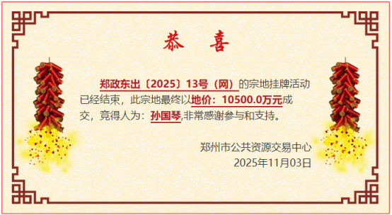 郑政东出〔2025〕13号(网)地块被孙国琴以10500万元摘得,溢价率达26.5%。