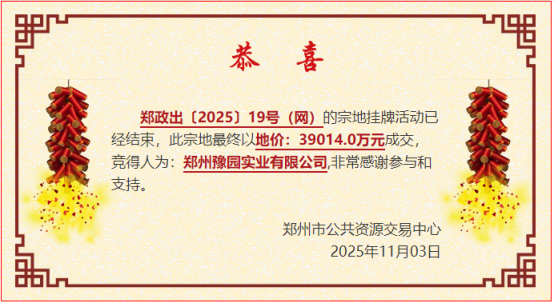 郑政出〔2025〕19号(网)地块被郑州豫园实业有限公司以底价39014万元摘得。