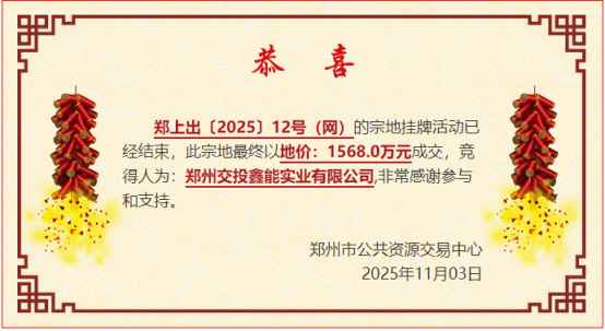 郑上出〔2025〕12号(网)地块被郑州交投鑫能实业有限公司以底价1568万元摘得。