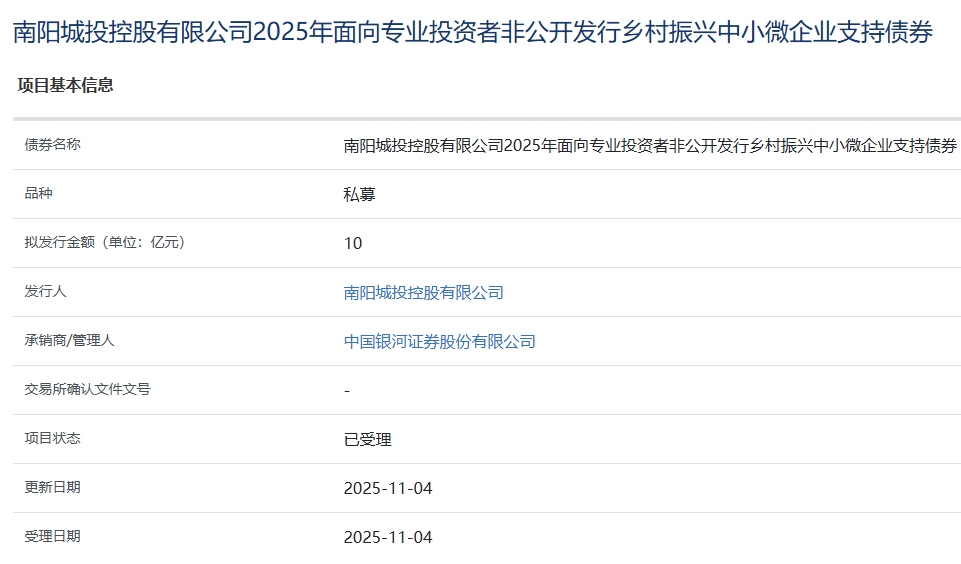 【大河财立方消息】11月4日消息,南阳城投控股有限公司2025年面向专业投资者非公开发行乡村振兴中小微企业支持债券项目获上交所受理。