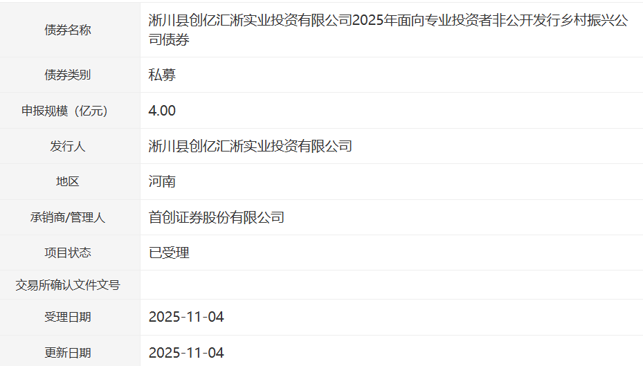 【大河财立方消息】11月4日,淅川县创亿汇淅实业投资有限公司2025年面向专业投资者非公开发行乡村振兴公司债券项目,获深交所受理。