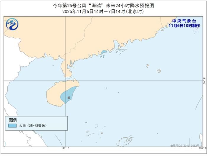 降水预报:6日14时至7日14时,海南岛东南部的部分地区和广东西部沿海的局部地区将有大雨(25-45毫米)。