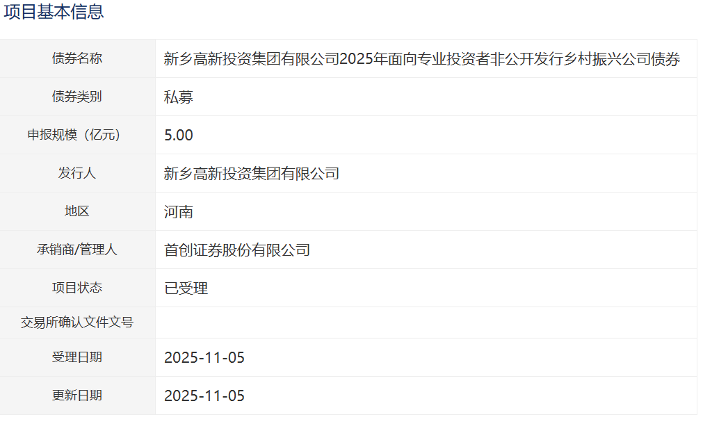 【大河财立方消息】11月6日消息,新乡高新投资集团有限公司2025年面向专业投资者非公开发行乡村振兴公司债券项目获深交所受理。本期债券拟发行规模5亿元,承销商/管理人为首创证券。