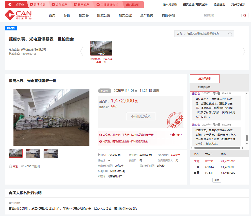 郑州拍卖总行相关负责人介绍,此次废旧水表处置是循环经济实践的一次成功探索。通过市场化竞拍方式,不仅为委托方郑州自来水控股有限公司实现了资产增值,更构建了“报废-回收-再生-利用”的资源循环闭环。相较于传统处置模式,云端竞拍不仅提升了交易效率,更通过充分竞争实现了废旧物资价值最大化,溢价率远超预期,为同类废旧物资处置提供了可复制、可推广的经验。